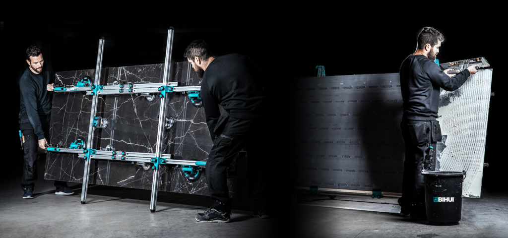 La manipulación de grandes losas, por ejemplo, ya no puede hacerse sin sistemas que garanticen seguridad y estabilidad. Lo mismo ocurre con la nivelación en piezas de gran formato, donde un pequeño desnivel se traduce en un defecto muy visible. En estos casos, contar con herramientas adecuadas no solo mejora el resultado final, sino que reduce errores, retrabajos y esfuerzo físico.